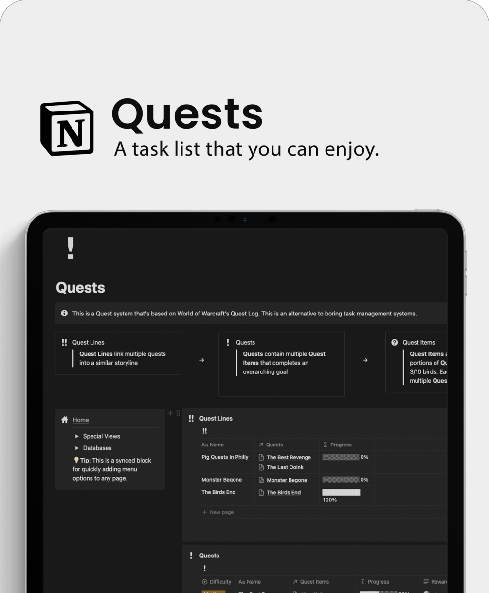 Are your to-do lists feeling like a grind? Transform your daily tasks into an epic journey with this Notion Quest Template! Inspired by the thrill of completing quest chains in RPGs like World of Warcraft, this template gamifies your productivity and helps you stay motivated every day.